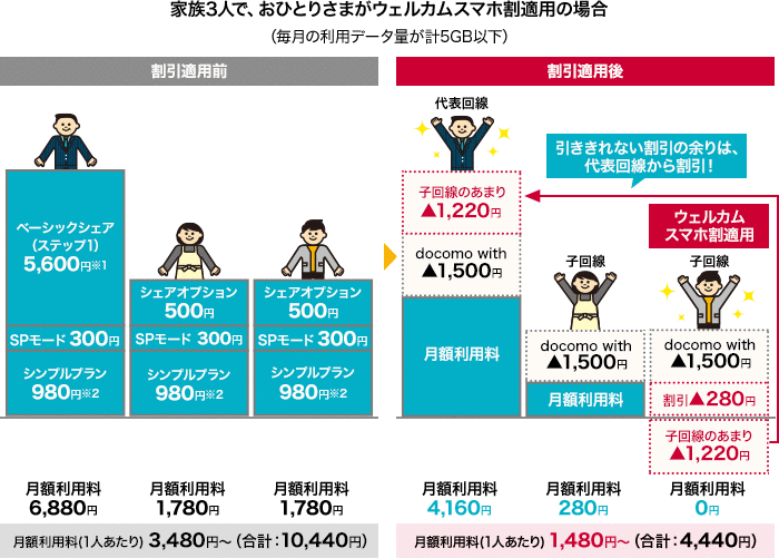 シェア子回線でウェルカムスマホ割を使って割引が溢れたら主回線から割引される